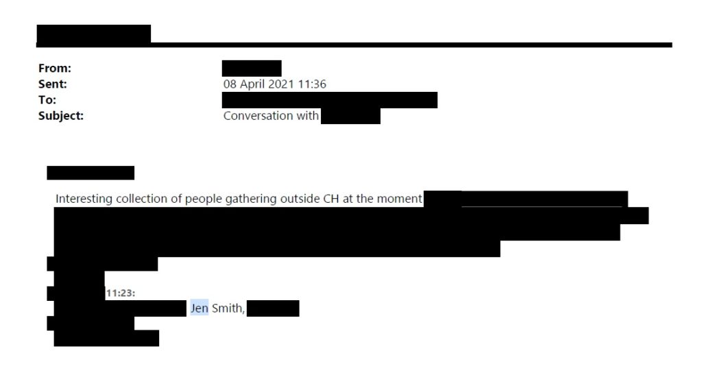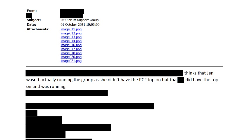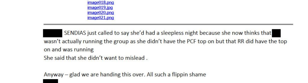 ‘[REDACTED] SENDIAS just called to say she’d had a sleepless night because she now thinks that [REDACTED] wasn’t actually running the group as she didn’t have the PCF top up…’