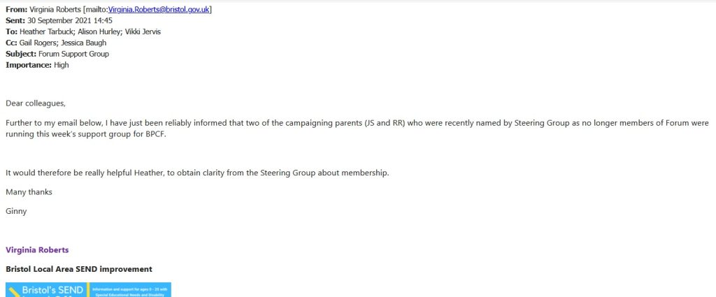 Presumably it was SENDIAS in the below email of September 2021 that informed Bristol City Council of the parents it doesn’t like having the audacity to run a Send support group in south Bristol.